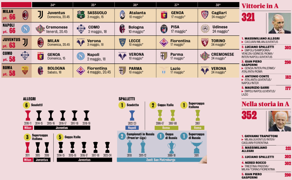Итого: разделенные 80 километрами, но объединенные общей нитью — путевкой в элиту Европы. В воскресенье вечером на «Сан-Сиро» пойдет борьба за подиум, возможно, самый высокий. Это будет уже 16-я встреча двух тренеров лицом к лицу. Последний раз, ровно три года назад, Спаллетти светился от счастья: его «Наполи» подтвердил чемпионский триумф, вырвав победу на 90-й минуте на «Альянц Стадиуме» благодаря голу Распадори, после разгрома «Юве» в первом круге со счетом 5:1. Будучи тренером «Наполи», Лучо ни разу не проигрывал «бьянконери» Макса: четыре дуэли, три победы.