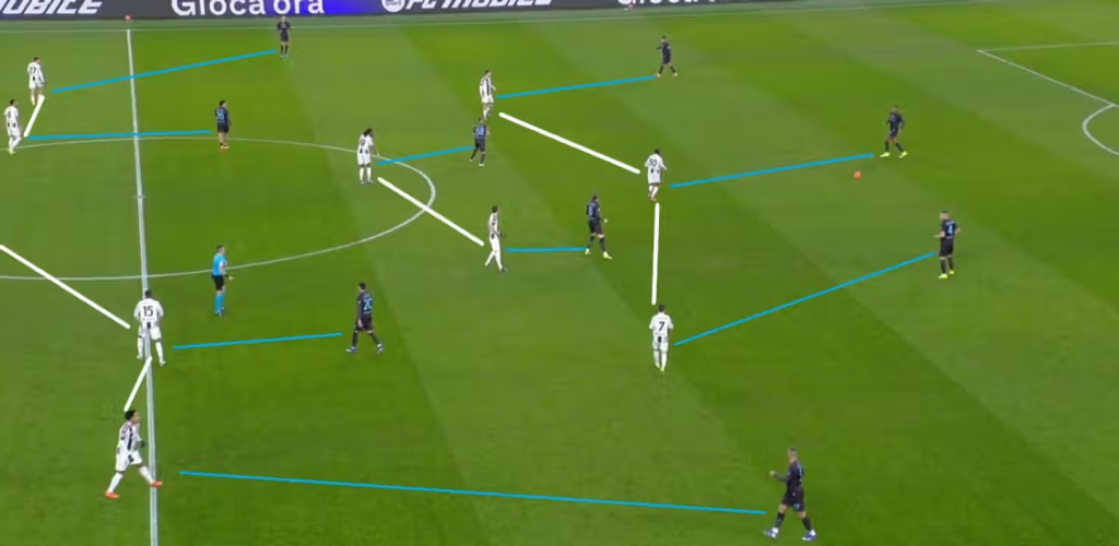 «Ювентус» по ходу матча варьировал высоту и интенсивность персонального прессинга. Бьянконери начали встречу с высокого и агрессивного прессинга, а после гола при счёте 1:0, по мере расхода сил, решили сократить игровое пространство, в котором вели индивидуальные дуэли, не теряя при этом эффективности в предотвращении любой угрозы воротам Ди Грегорио. До момента с шансом у Лукаку (при счёте 3:0, уже в добавленное время второго тайма) «Наполи» создал всего 0,34 xG, нанеся лишь 7 ударов, из которых 2 — со стандартов, только один — в створ и лишь один — из пределов штрафной площади.
