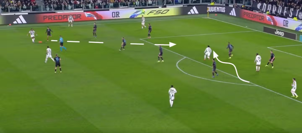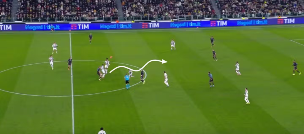 «Ювентус» начинает розыгрыш снизу, а «Наполи» пытается высоко прессинговать. Камбьязо ищет длинную передачу за спины линии прессинга — на Маккенни, который оказывается без опеки на противоположном фланге относительно своей номинальной позиции. Приём мяча Маккенни растягивает оборону «Наполи» и раскрывает поле для «Ювентуса», после чего американец отдаёт передачу в глубину на Йилдыза. В завершение этой атаки «Ювентус» забивает гол — отличился Джонатан Дэвид.