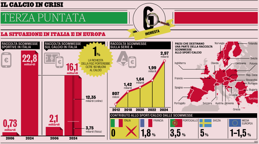 Один из ключевых способов приблизиться к другим чемпионатам и выровняться с европейскими странами — это ставки, а именно признание доли доходов от беттинга в пользу тех, кто организует события, на которые делаются ставки. Согласно отчёту Федерации футбола Италии (ФФИ) за 2025 год, в 2024 году объём ставок на спорт в Италии достиг 22,8 млрд евро. Если учесть, что в 2000 году он составлял 730 млн, рост составил примерно в 30 раз. Из этих почти 23 млрд — 16,1 млрд приходится на футбол. И здесь рост также стабилен: с 2012 года показатель почти утроился.
