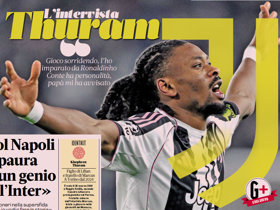«В детстве я познакомился со многими великими игроками у нас дома. Я говорю о Виейра, Анри или Тудоре, который подарил мне и моему брату потрясающего робота. Антонио Конте я не помню, но папа много рассказывал мне о нём и о его «ювентийском» характере». Сегодня вечером Кефрен Тюрам вновь встретится с бывшим партнёром своего отца — уже на новой «домашней» арене, «Альянц Стэдиум». Матч против действующих чемпионов Италии может либо дать новый импульс чемпионской гонке «Ювентуса», либо полностью её затормозить. «Страх? В футболе ему нет места. У нас сильная команда и тренер высокого уровня, а в «Ювентусе» нужно побеждать», — говорит Тюрам. У Кефрена широкие плечи и привычная улыбка — фирменный знак семьи, как и у его брата, интериста Маркюса: «Когда папа перешёл из «Ювентуса» в «Барселону», мы часто ездили с ним на тренировки. Месси был совсем юным, но уже невероятно сильным, и однажды подарил Маркюсу пару бутс. Роналдиньо, помимо феноменальной игры с мячом, был добрым и всегда солнечным человеком. Мы с братом немного переняли его улыбку. Жизнь прекрасна, и нужно уметь смеяться».