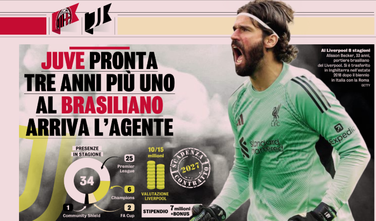 Ситуация накаляется: как раз в дни суперматча против «Милана» на «Сан-Сиро» запланирована новая встреча между руководством «Ювентуса» и окружением Алиссона. Устное принципиальное согласие уже достигнуто, теперь стороны хотят собрать воедино экономический пазл. Оптимизм растет, несмотря на то что в Англии бразилец получает около 6–7 миллионов евро, а его контракт действует до 2027 года (после активации опции продления «Ливерпулем»).