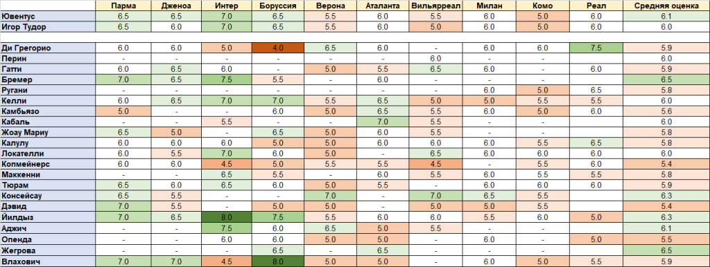 Предлагаем вашему вниманию сборную информацию по оценкам игрокам и тренеру «Ювентуса» за текущий сезон от издания Gazzetta dello Sport. Здесь отражаются суммарные оценки за сезон с учётом официальных матчей. Используя данную информацию, можно понаблюдать за динамикой игры футболистов.