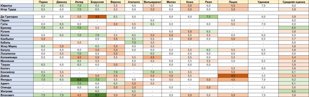 Предлагаем вашему вниманию сборную информацию по оценкам игрокам и тренеру «Ювентуса» за текущий сезон от издания Gazzetta dello Sport. Здесь отражаются суммарные оценки за сезон с учётом официальных матчей. Используя данную информацию, можно понаблюдать за динамикой игры футболистов.